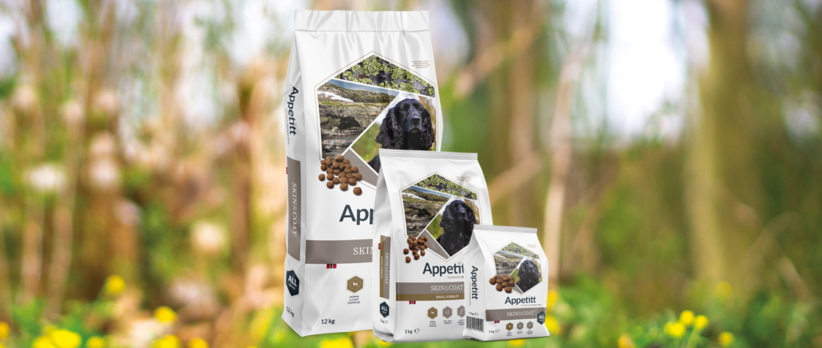 Appetitt Skin & Coat är anpassat för hundar av alla raser med normal aktivitetsnivå och har medelstora foderkulor. Det finns även i 3 kg med små foderkulor för små raser. Med sitt ökade energiinehåll är detta foder också idealiskt för hundar som behöver lite extra energi – antingen för viktuppgång eller under perioder med ökad aktivitet.